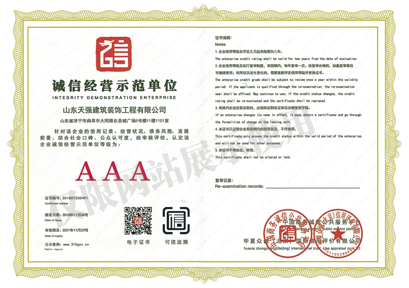 诚信经营示范单位